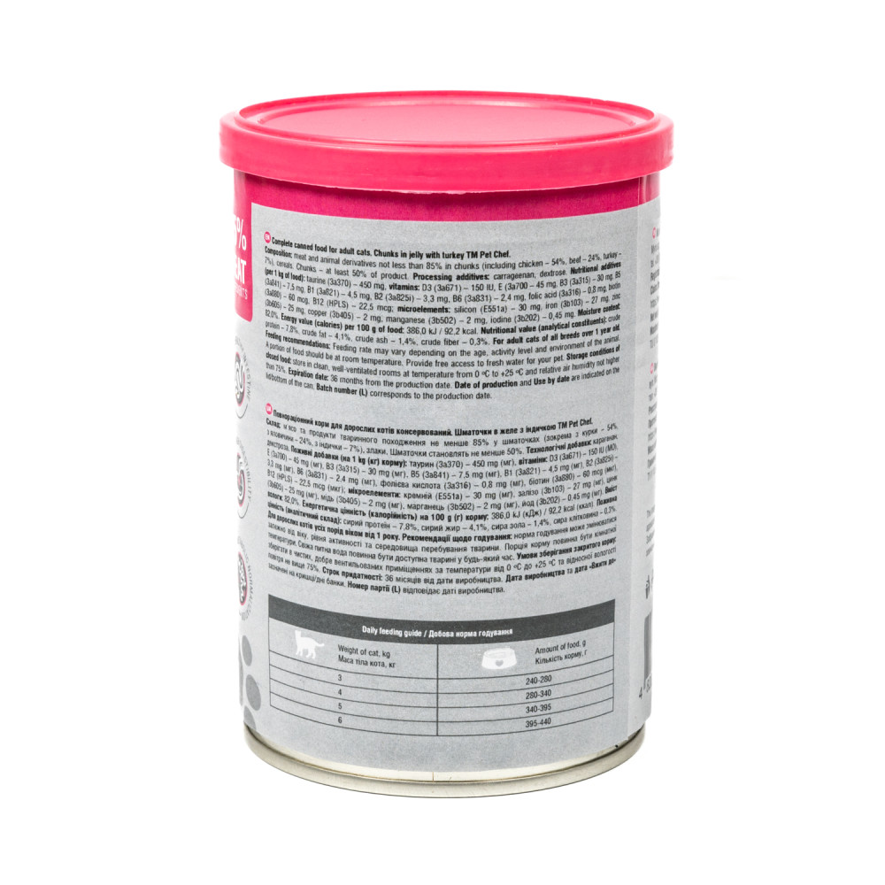 М’ясні шматочки в желе Pet Chef — це збалансований повнораціонний вологий корм для дорослих котів, який є чудовим вибором для тих, хто хоче забезпечити своїх улюбленців смачним та поживним раціоном. Кожен шматочок корму містить мінімум 85% м’ясних інгредієнтів, що задовольнить потреби тварини у білках та енергії, а також оптимальну комбінацію макро- і мікроелементів, вітамінів і амінокислот, необхідних для її розвитку та загального здоров’я. Желе підсилює апетитність, роблячи кожен шматочок надзвичайно соковитим і ароматним.