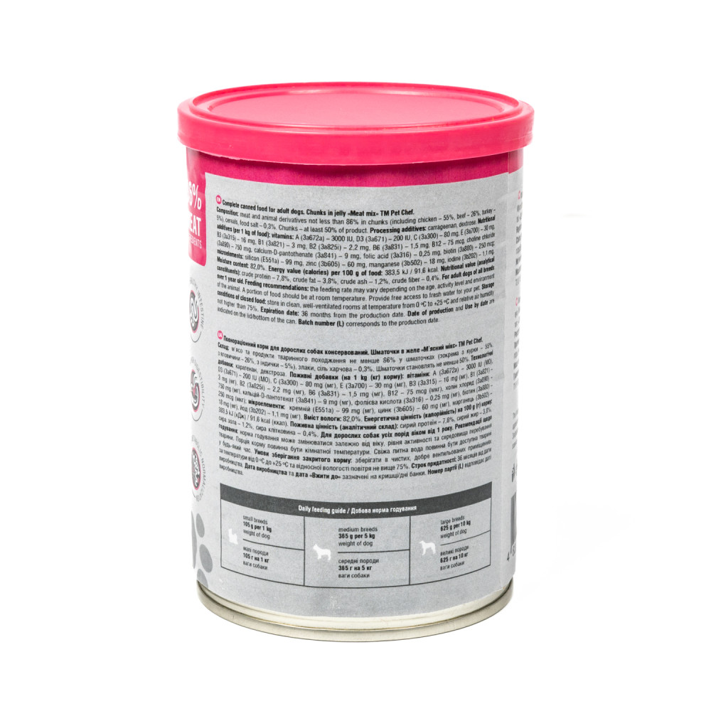М’ясні шматочки в желе Pet Chef — це збалансований повнораціонний вологий корм для дорослих собак, який є чудовим вибором для тих, хто хоче забезпечити своїх улюбленців смачним та поживним раціоном. Кожен шматочок корму містить мінімум 85% м’ясних інгредієнтів, що задовольнить потреби тварини у білках та енергії, а також оптимальну комбінацію макро- і мікроелементів, вітамінів і амінокислот, необхідних для її розвитку та загального здоров’я. Желе підсилює апетитність, роблячи кожен шматочок надзвичайно соковитим і ароматним.