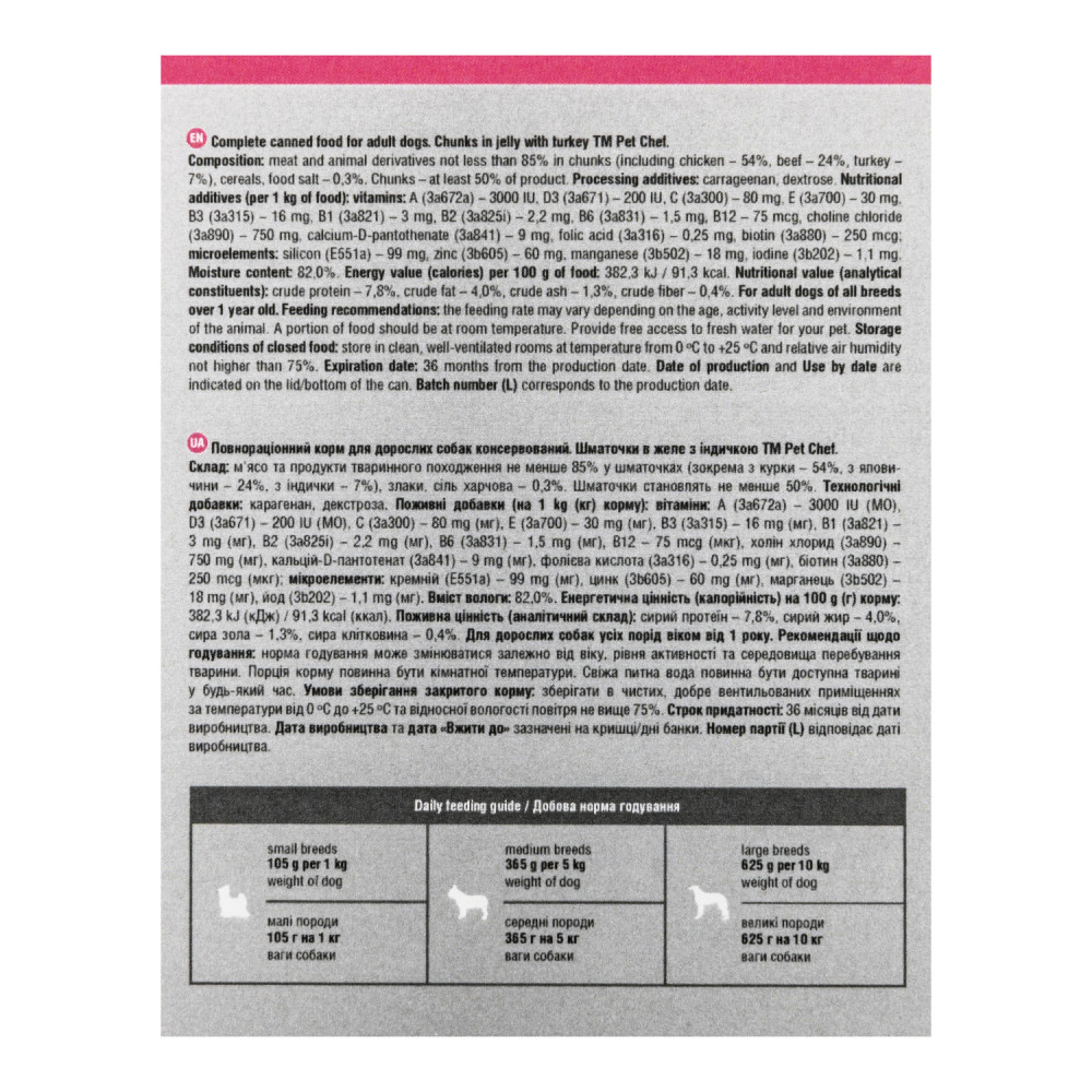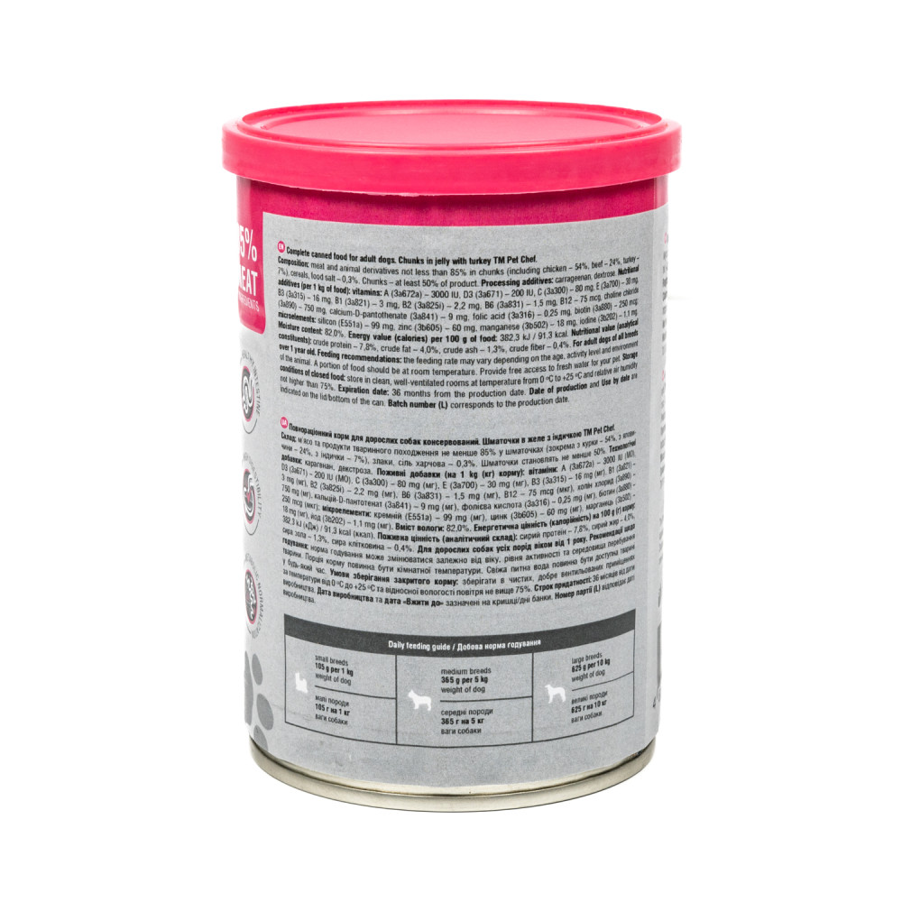 М’ясні шматочки в желе Pet Chef — це збалансований повнораціонний вологий корм для дорослих собак, який є чудовим вибором для тих, хто хоче забезпечити своїх улюбленців смачним та поживним раціоном. Кожен шматочок корму містить мінімум 85% м’ясних інгредієнтів, що задовольнить потреби тварини у білках та енергії, а також оптимальну комбінацію макро- і мікроелементів, вітамінів і амінокислот, необхідних для її розвитку та загального здоров’я. Желе підсилює апетитність, роблячи кожен шматочок надзвичайно соковитим і ароматним.