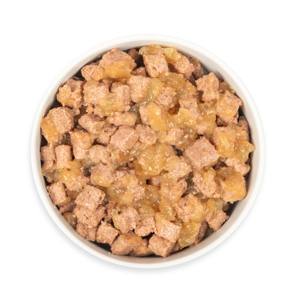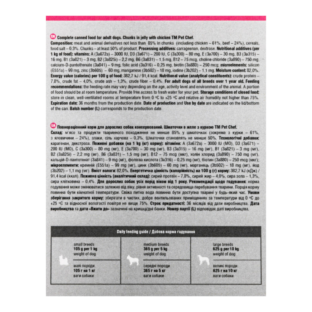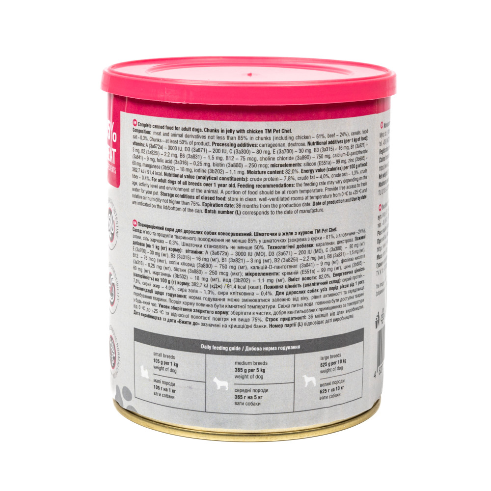 М’ясні шматочки в желе Pet Chef — це збалансований повнораціонний вологий корм для дорослих собак, який є чудовим вибором для тих, хто хоче забезпечити своїх улюбленців смачним та поживним раціоном. Кожен шматочок корму містить мінімум 85% м’ясних інгредієнтів, що задовольнить потреби тварини у білках та енергії, а також оптимальну комбінацію макро- і мікроелементів, вітамінів і амінокислот, необхідних для її розвитку та загального здоров’я. Желе підсилює апетитність, роблячи кожен шматочок надзвичайно соковитим і ароматним.