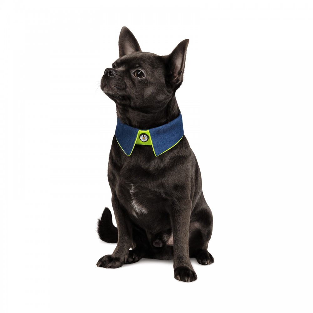 Стильний аксесуар для чотирилапих модників. Комірець з темно-синьої джинсової тканини та яскраво-лимонної бавовни надійно фіксується липучкою, яка міцно тримається. Прикрашає комірець ґудзик-ромашка. Досить лише цього маленького аксесуару, щоб створити досконалий літній образ.