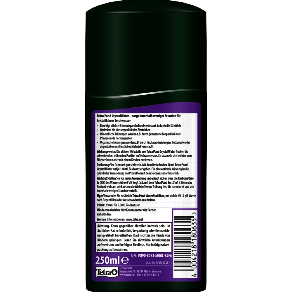 Застосування і дозування: добре струсіть перед застосуванням. На кожні 1000 літрів води у водоймі слід додати 50 мл засобу Tetra Pond CrystalWater. Для цього використовуйте мірну склянку. Для найкращого результату переконайтеся в рівномірному розподілі засобу у воді водойми.