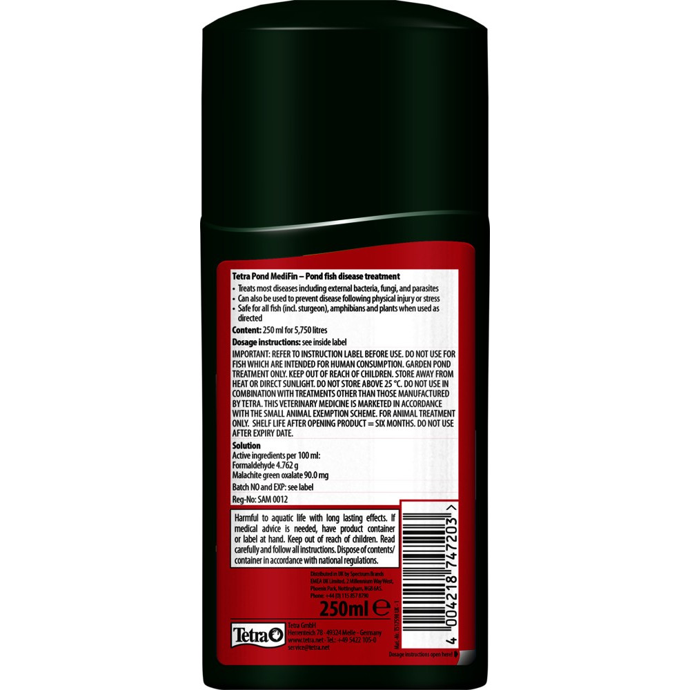 Застосування і дозування: добре струсіть перед застосуванням. На кожні 1000 л води в садовому ставку слід додати 50 мл Tetra Pond MediFin, рівномірно розподіливши засіб по поверхні води.