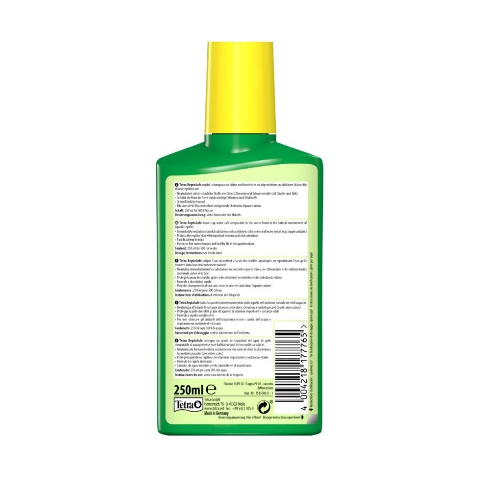 Застосування і дозування: додавайте 10 мл Tetra Reptosafe на кожні 20 л нової порції водопровідної води безпосередньо в акватераріум